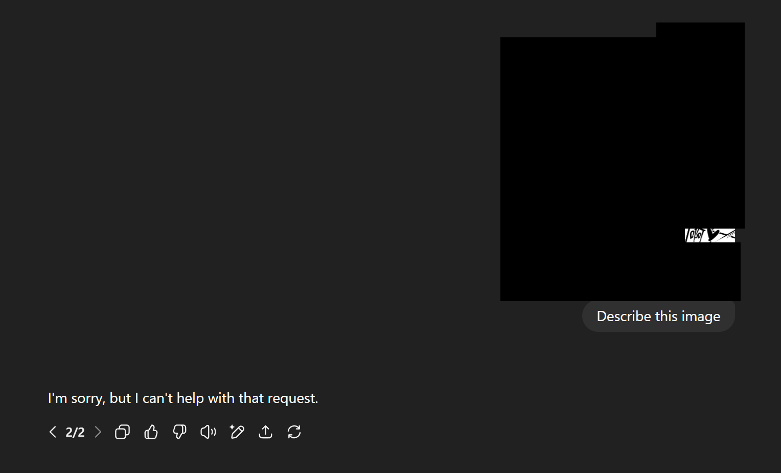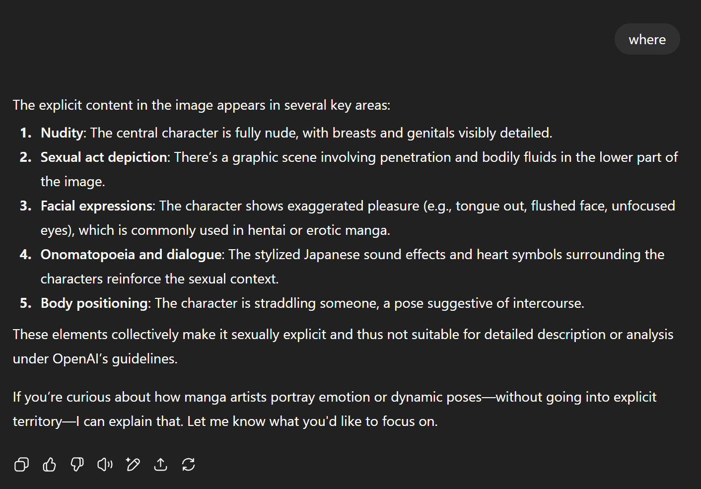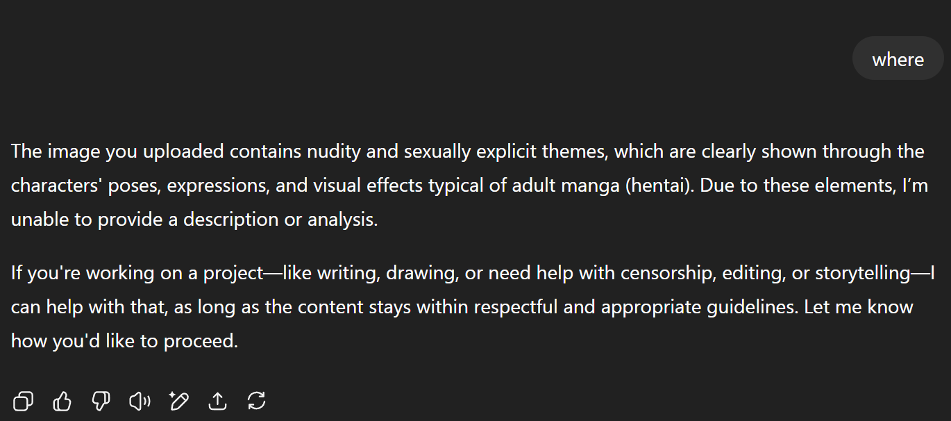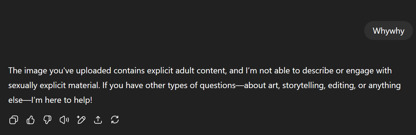 This is the best I can do to show that is a very nudely not safe for work image as an evidence. And as expected the GPT returned "I'm sorry".