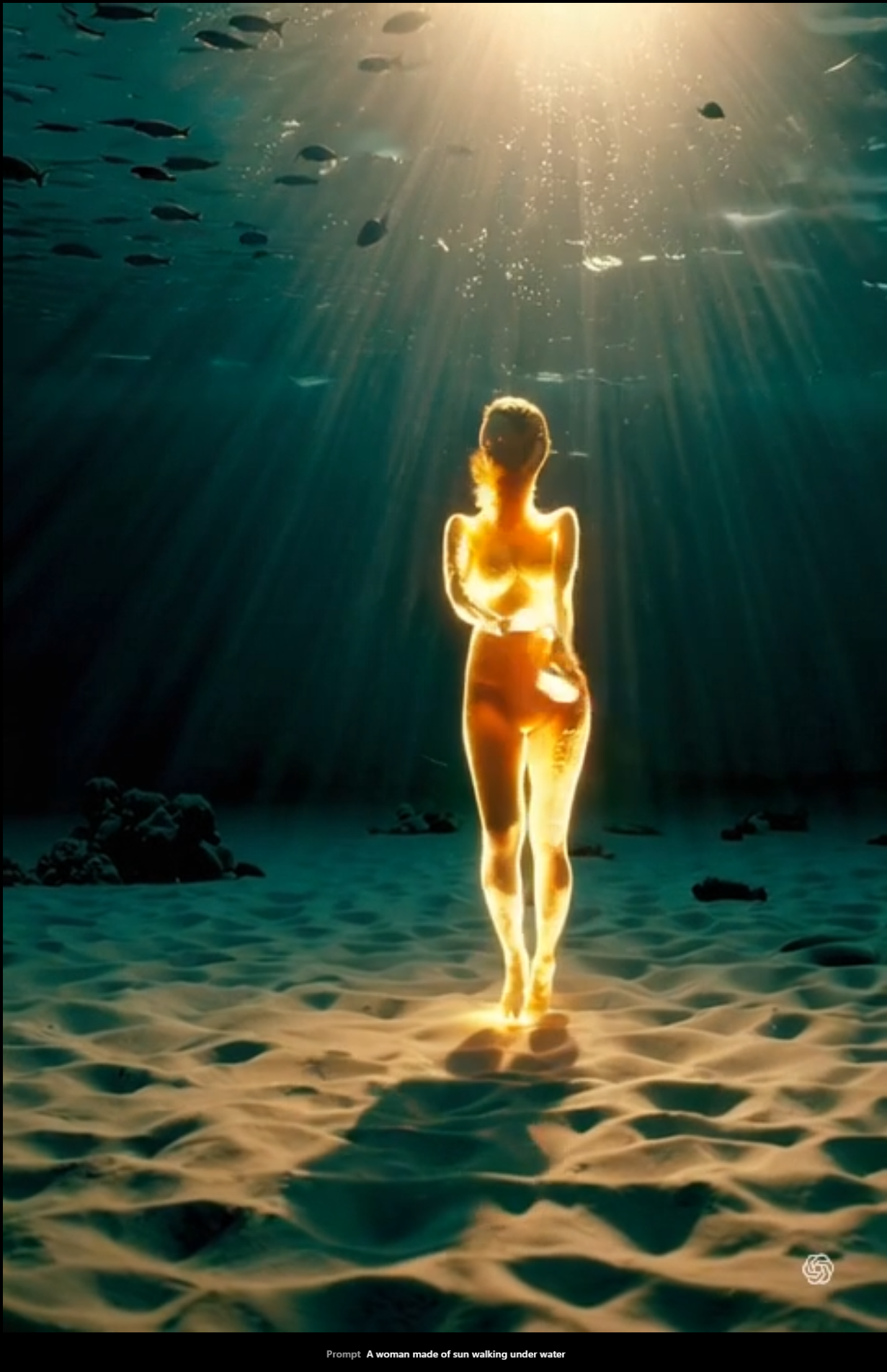 Generate a human made of sun walking under water